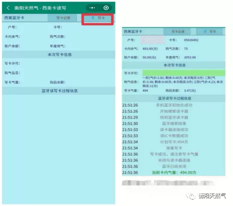 5、充值成功后將燃?xì)饪ㄐ酒虏迦胨{(lán)牙讀卡器中,點(diǎn)擊寫卡可將儲(chǔ)存余額轉(zhuǎn)充成氣量。(如顯示寫卡不成功,可再次點(diǎn)擊寫卡重試,轉(zhuǎn)氣時(shí)不能關(guān)閉藍(lán)牙。)