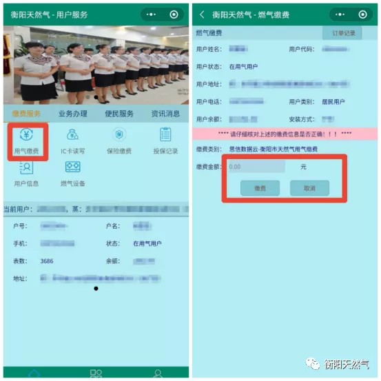 3、進(jìn)入主頁面點(diǎn)擊用氣繳費(fèi)進(jìn)行氣費(fèi)儲(chǔ)存。(普通機(jī)表直接繳費(fèi)即充值成功)
