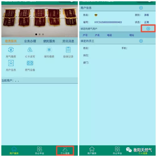 2、點(diǎn)擊右下角個(gè)人信息選項(xiàng),按+字符號(hào)綁定戶號(hào)、手機(jī)號(hào)、身份證號(hào)碼。(綁定內(nèi)容需與開戶資料一致)。